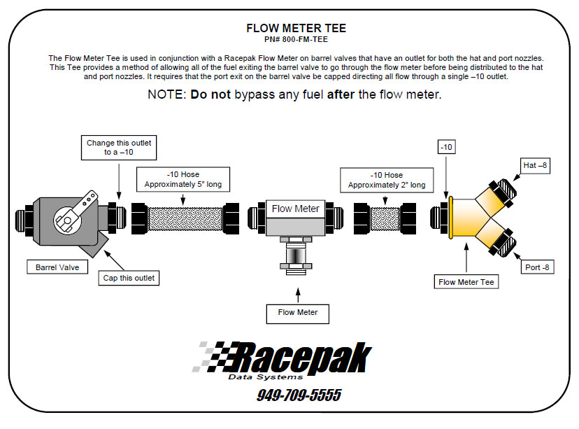 Flow meters consist of two components. The actual flow device to be installed into the fuel line and the V-net module to bring the information into the Racepak logger.